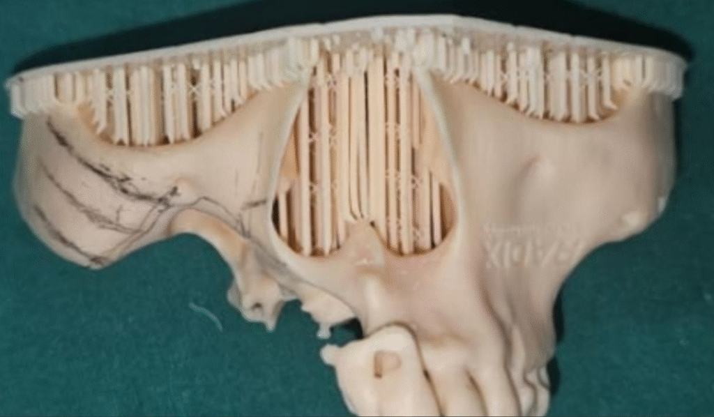 To tackle the complexity, the decision was made to create a 3D-printed maxillary model. This model, based on the patient’s CT scan, served as an exact replica of the residual bone and defect. The oral surgeon then performed a mock surgery on the printed model to assess: